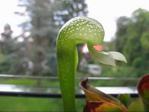 The leaf of Darlingtonia is unique: it is tubular, and contains a fluid that digests trapped insects. The upper part of the leaf, is modified for the trapping function. The end of the leaf is hooded. There is a circular opening through which insects can fly into the hood. If you look closely you can see the opening in. So why would they do so? One reason: on the two flag-like structures, there are glands that secrete sugary nectar, such as flies and other insects like to feed on. There are more nectar glands inside the hood, so an insect tends to progress right into the hood.